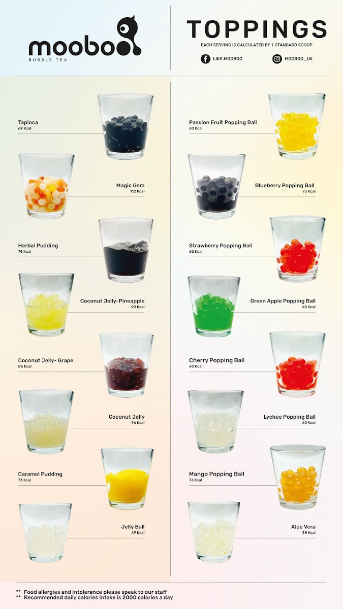 Delicious mooboo classic milk tea with creme Brûlée cream on top and caramelized brown sugar Contains milk [including lactose]. Ice level is fixed at 25%.799 kcal