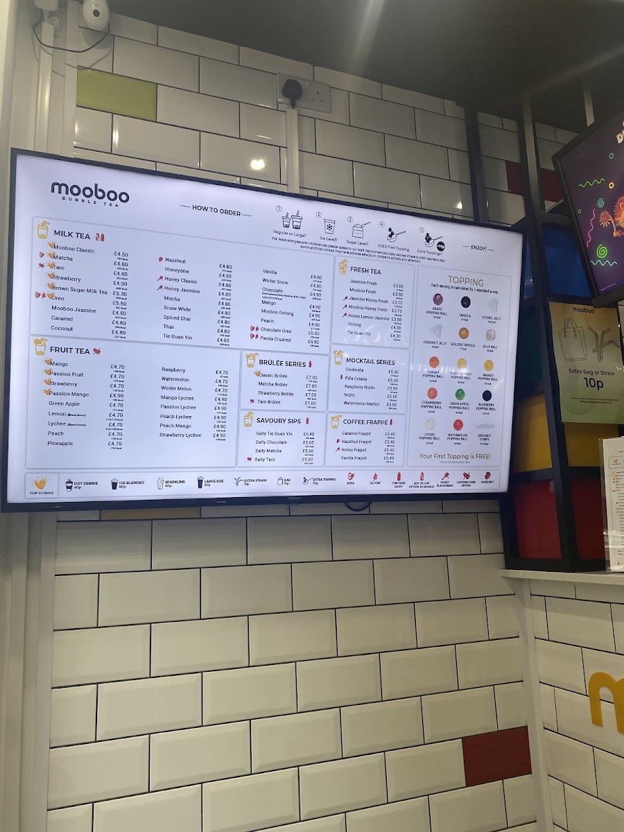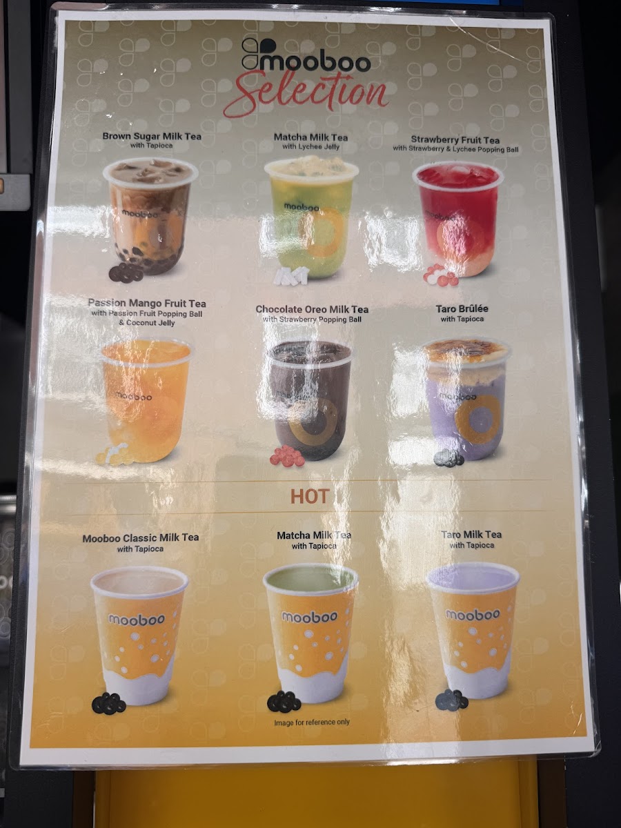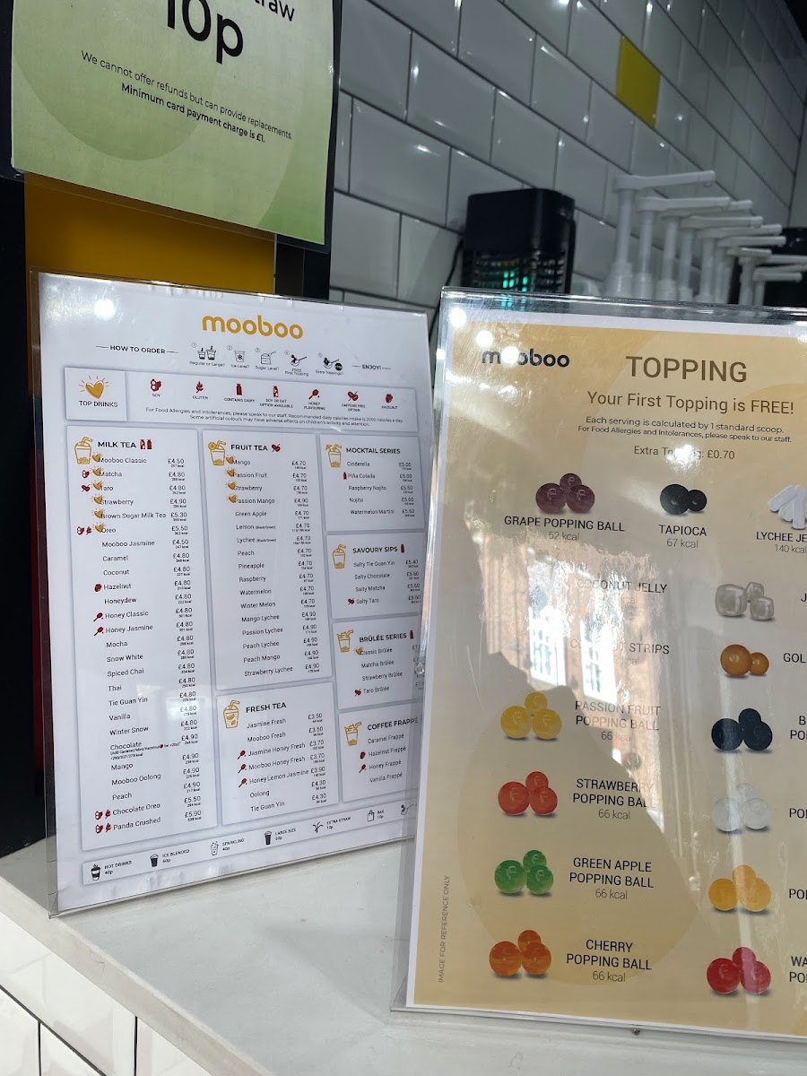 Mooboo Knightsbridge offers a delightful and diverse menu that caters to both drink and food enthusiasts. For matcha lovers, the Matcha Green Tea, Lychee Matcha, and Chocolate Matcha are standout options, with a rich variety that even includes Matcha Brulee for those craving a dessert-inspired drink. For coffee aficionados, the Signature Coffee options are complemented by indulgent drinks like the Brown Sugar Latte and Caramel Frappe. If you're in the mood for something unique, their Boba Latte and Caramel Boba Latte will hit the spot. The Cocosnow Series (ice-blended drinks) offers refreshing choices like Coco Honeydew Melon and Coco Mango, while fruit tea options such as Strawberry + Lychee and Passion Fruit bring a fresh burst of flavor. For milk tea lovers, options like Chocolate Oreo Milk and Honeydew Milk are creatively crafted. The Brûlée Series features sweet treats like Honeydew Melon Brulee and Taro Brulee, perfect for those with a sweet tooth. To balance out the sweetness, their Fresh Tea range, including Mooboo Fresh and Jasmine Honey Fresh, offers lighter, more refreshing options. Mocktail lovers can enjoy the tropical Pina Colada. For those craving a quick bite, the SG Mochi Mango Box and various SG Mochi flavors like Matcha and Strawberry provide a delightful snack. The restaurant also offers fun merchandise, including eco-friendly cups and reusable straws.