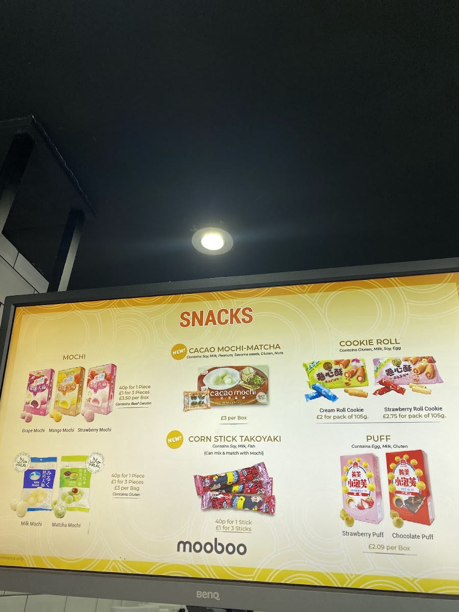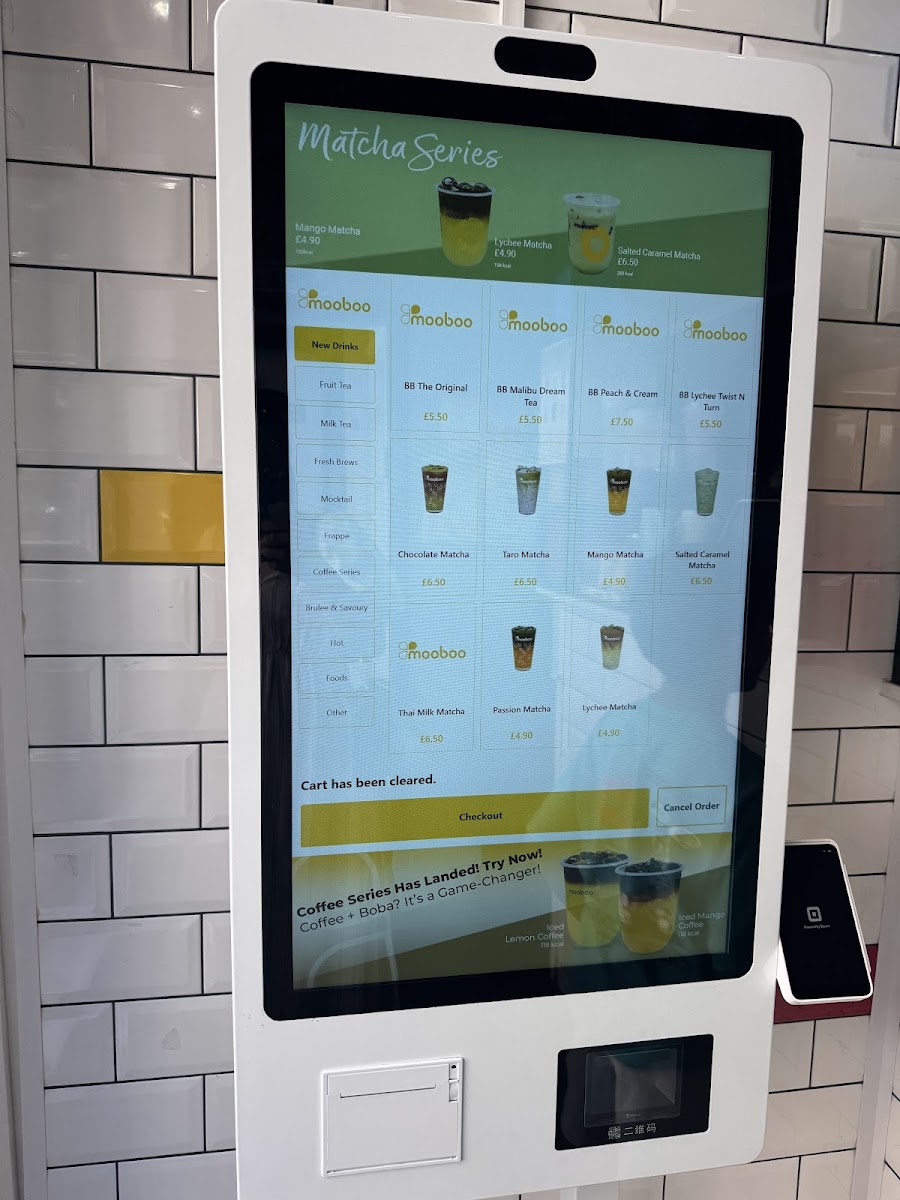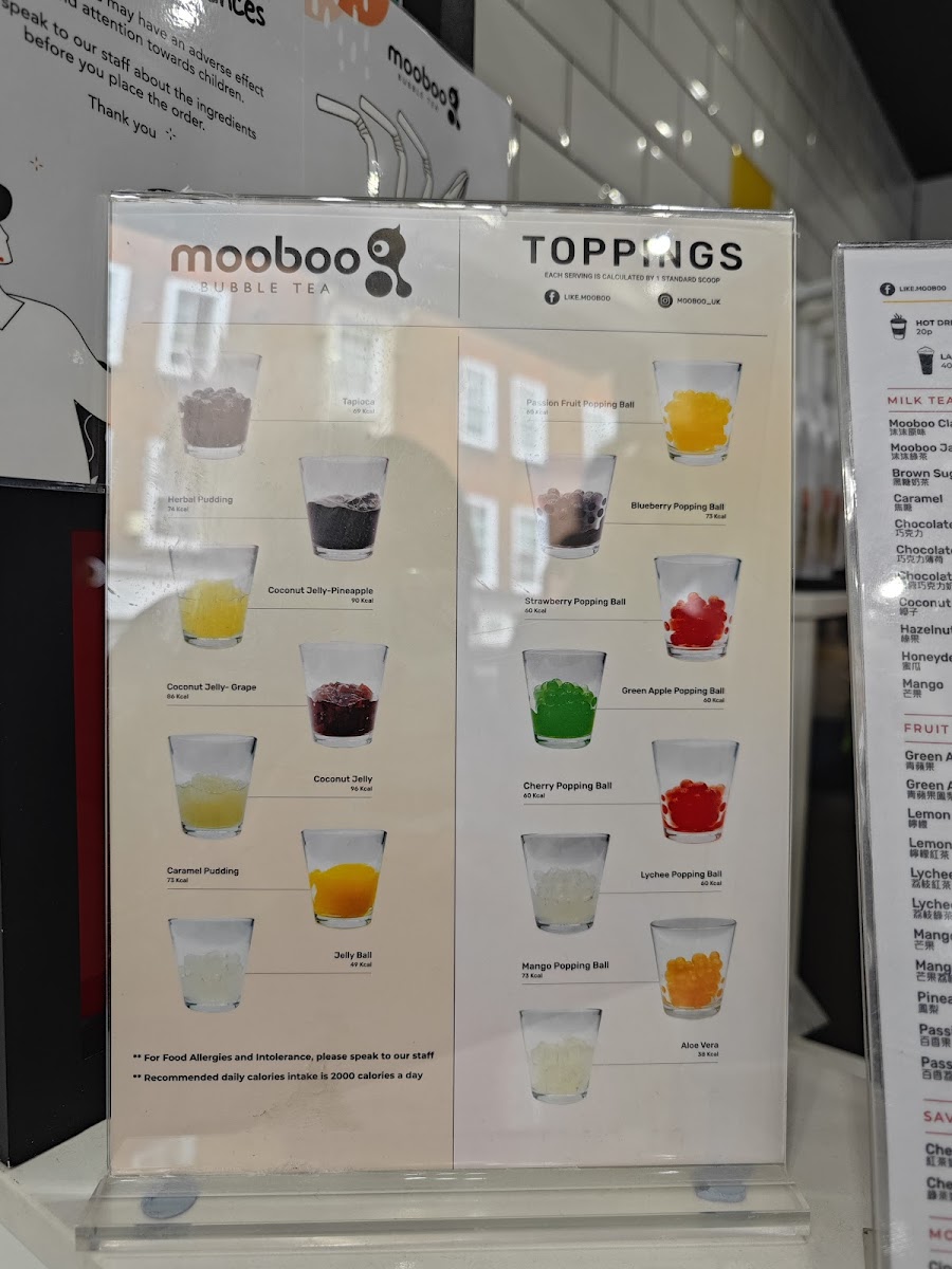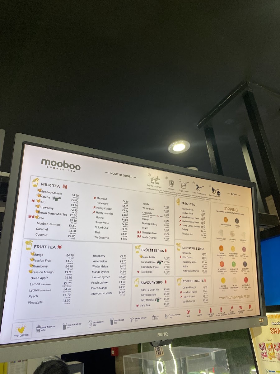 Mooboo Knightsbridge offers a delightful and diverse menu that caters to both drink and food enthusiasts. For matcha lovers, the Matcha Green Tea, Lychee Matcha, and Chocolate Matcha are standout options, with a rich variety that even includes Matcha Brulee for those craving a dessert-inspired drink. For coffee aficionados, the Signature Coffee options are complemented by indulgent drinks like the Brown Sugar Latte and Caramel Frappe. If you're in the mood for something unique, their Boba Latte and Caramel Boba Latte will hit the spot. The Cocosnow Series (ice-blended drinks) offers refreshing choices like Coco Honeydew Melon and Coco Mango, while fruit tea options such as Strawberry + Lychee and Passion Fruit bring a fresh burst of flavor. For milk tea lovers, options like Chocolate Oreo Milk and Honeydew Milk are creatively crafted. The Brûlée Series features sweet treats like Honeydew Melon Brulee and Taro Brulee, perfect for those with a sweet tooth. To balance out the sweetness, their Fresh Tea range, including Mooboo Fresh and Jasmine Honey Fresh, offers lighter, more refreshing options. Mocktail lovers can enjoy the tropical Pina Colada. For those craving a quick bite, the SG Mochi Mango Box and various SG Mochi flavors like Matcha and Strawberry provide a delightful snack. The restaurant also offers fun merchandise, including eco-friendly cups and reusable straws.