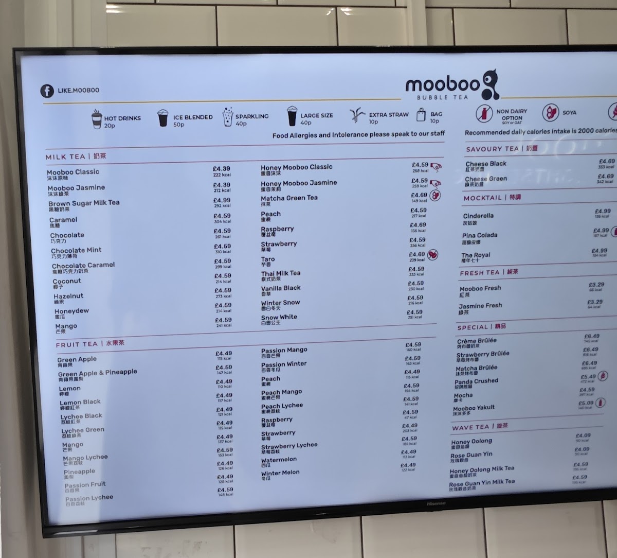 Smooth milk tea with a sweet peach flavour. Contains milk [including lactose]. Soy or oat option available. Hot option available.263 kcal
